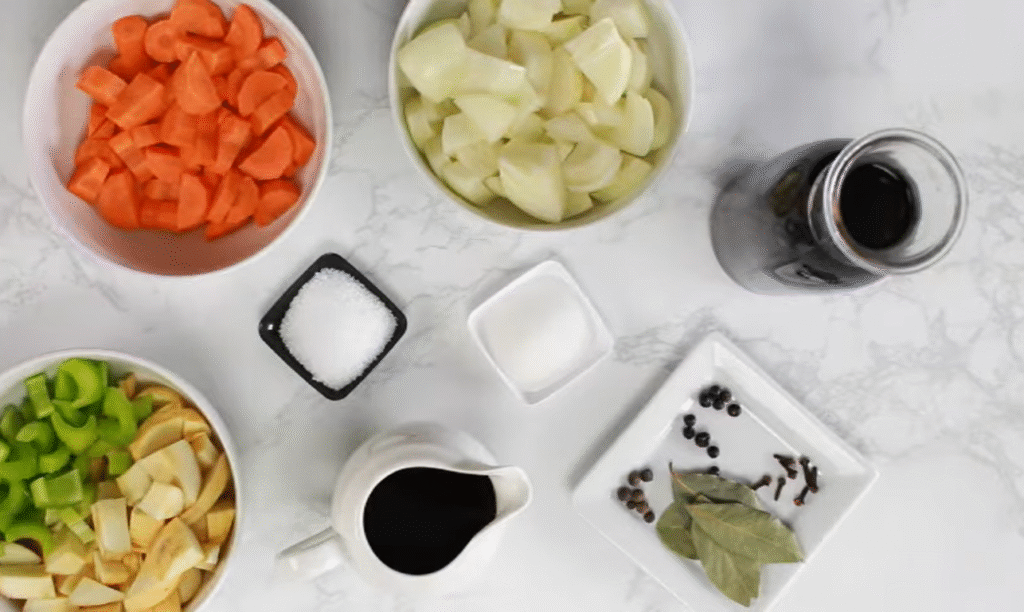 Der erste und wichtigste Schritt für echten Sauerbraten ist das Einlegen. Dafür bereitest du die Marinade wie folgt zu: