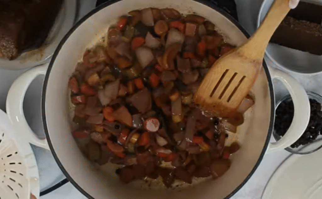Herausnehmen und das abgeseihte Gemüse im Bratensatz anrösten.