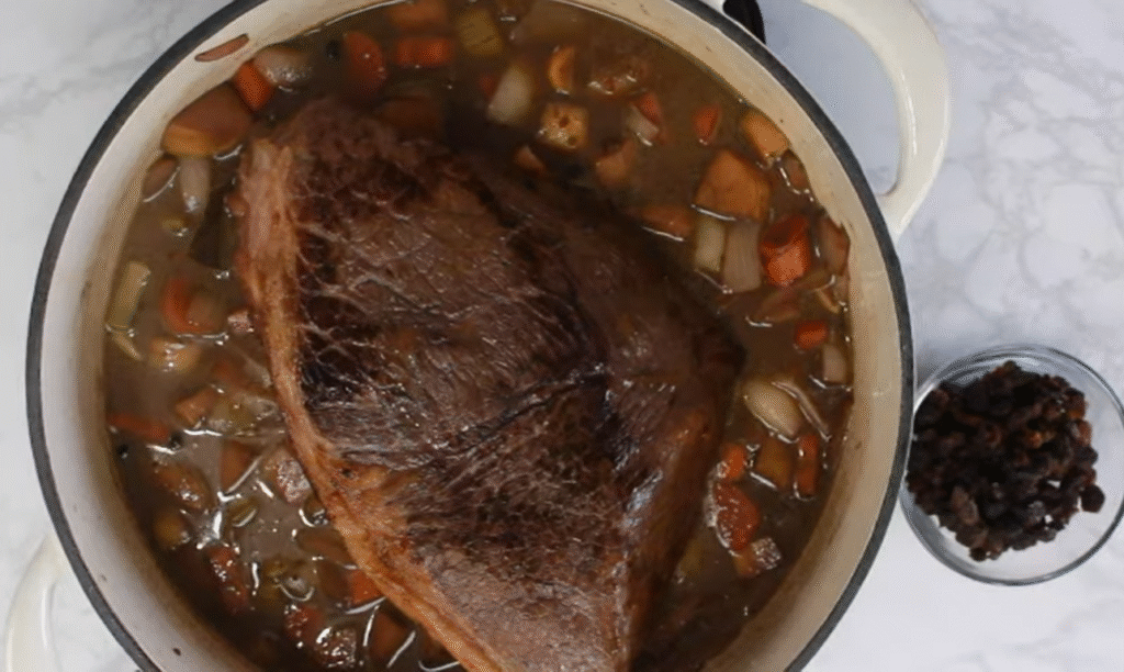 Wie bereits erwähnt: Rindfleisch ist der Favorit. Besonders gut geeignet ist Bug, Schulter oder Oberschale. Diese Teile haben genug Bindegewebe, um beim langen Schmoren herrlich zart zu werden.